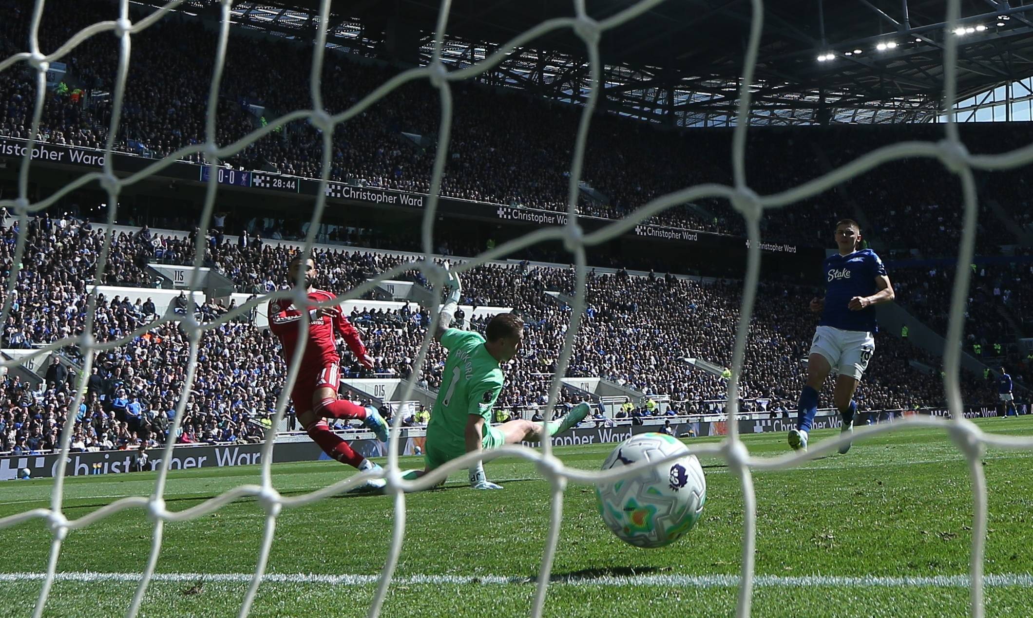 4月19日,利物浦队球员科内特(中上)与埃弗顿队门将皮克福德(中下)拼抢。 新华社/欧新